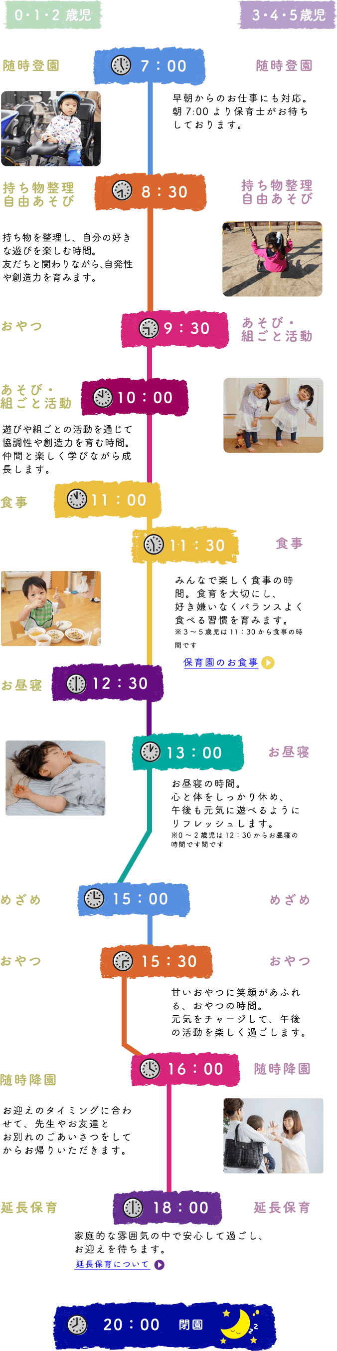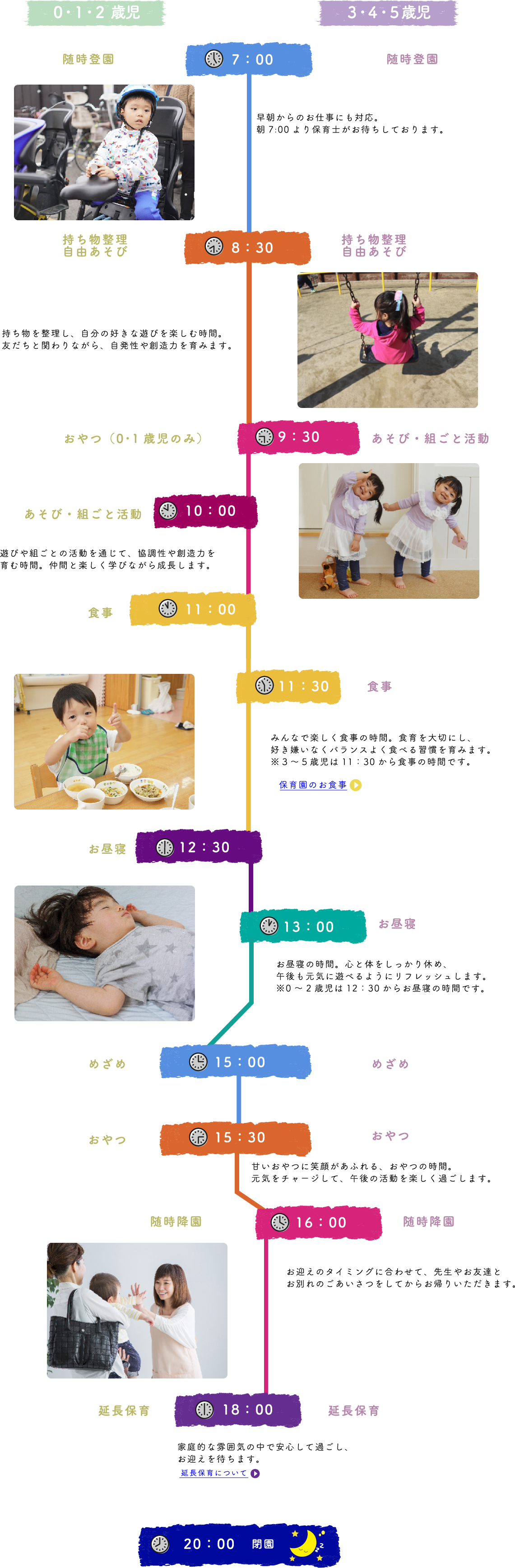 延長保育はアイリス保育園に入所している乳幼児で保護者の勤務等のご都合で午後6時を超えて保育を必要とする方に行っています。